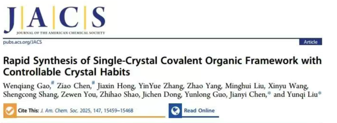 Wenqiang Gao†, Ziao Chen†, Jiaxin Hong, YinYue Zhang, Zhao Yang, Minghui Liu, Xinyu Wang, Shengcong Shang, Zewen You, Zhihao Shao, Jichen Dong, Yunlong Guo, Jianyi Chen*, and Yunqi Liu*,Title: Rapid Synthesis of Single-Crystal Covalent Organic Framework with Controllable Crystal Habits, J. Am. Chem. Soc. 2025, 147, 18, 15459–15468.