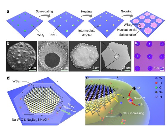 ✦揭示了晶体生长过程是由熔融盐铺展驱动的,铺展过程既作为微反应器为化学反应提供局域化介质,避免了传统化学气相沉积法的全局成核,同时又作为液态基底将反应限制于液态熔融盐表面,保证了高质量单层二维晶体的生长。